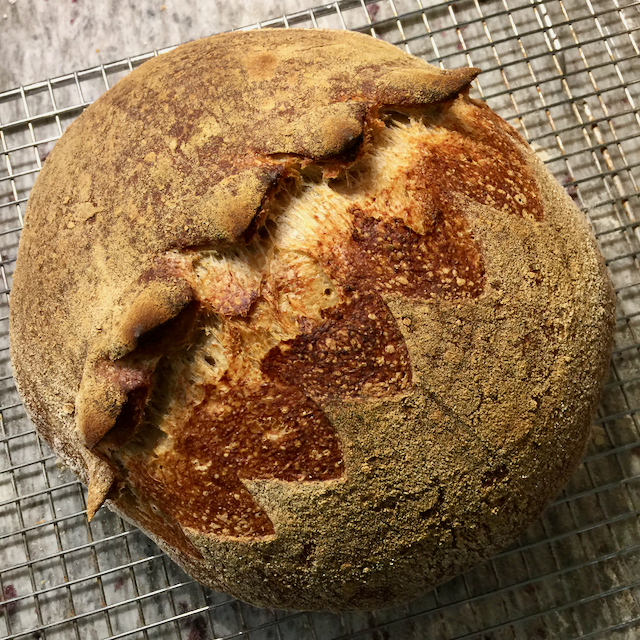 IMG_0909 September 29, 2019 Sunday Bake – Home Milled Palouse Wheat Berries 640 × 640 That perfect little round hole on top is where I took the temperature (if you wondered) Sourdough loaf made with part Palouse Hard Red Winter Wheat berries ground to flour.