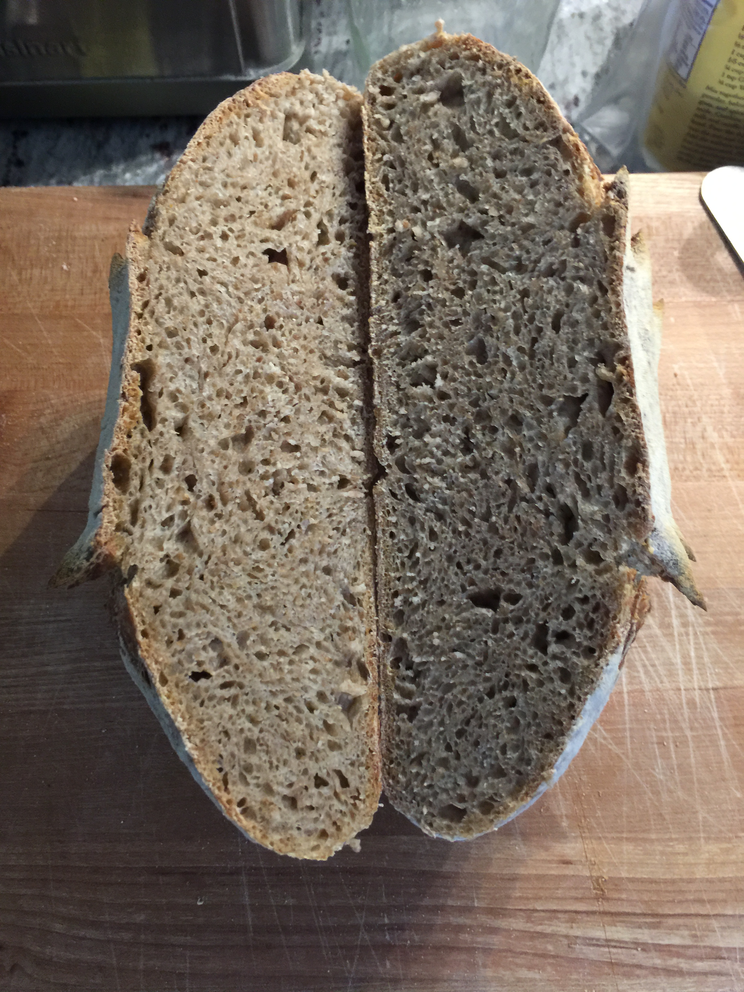 IMG_0923 October 5, 2019 Saturday’s “Sunday Bake” and More Changes in Technique 2448 × 3264 Crumb about typical for my loaves. Slashes down center only might’ve got better oven spring.